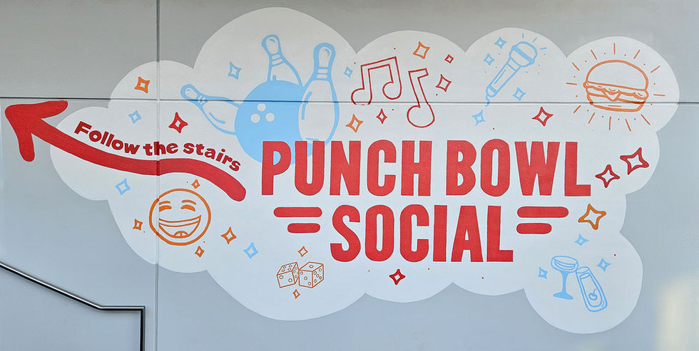 Working with the newly developed brand elements, I designed a mural that merges bold graphics with recognizable Punch Bowl Social motifs. The composition was built for scale, movement, and energy—designed to feel immersive rather than decorative. The piece was hand-painted in acrylic to maintain vibrancy and character at full size.